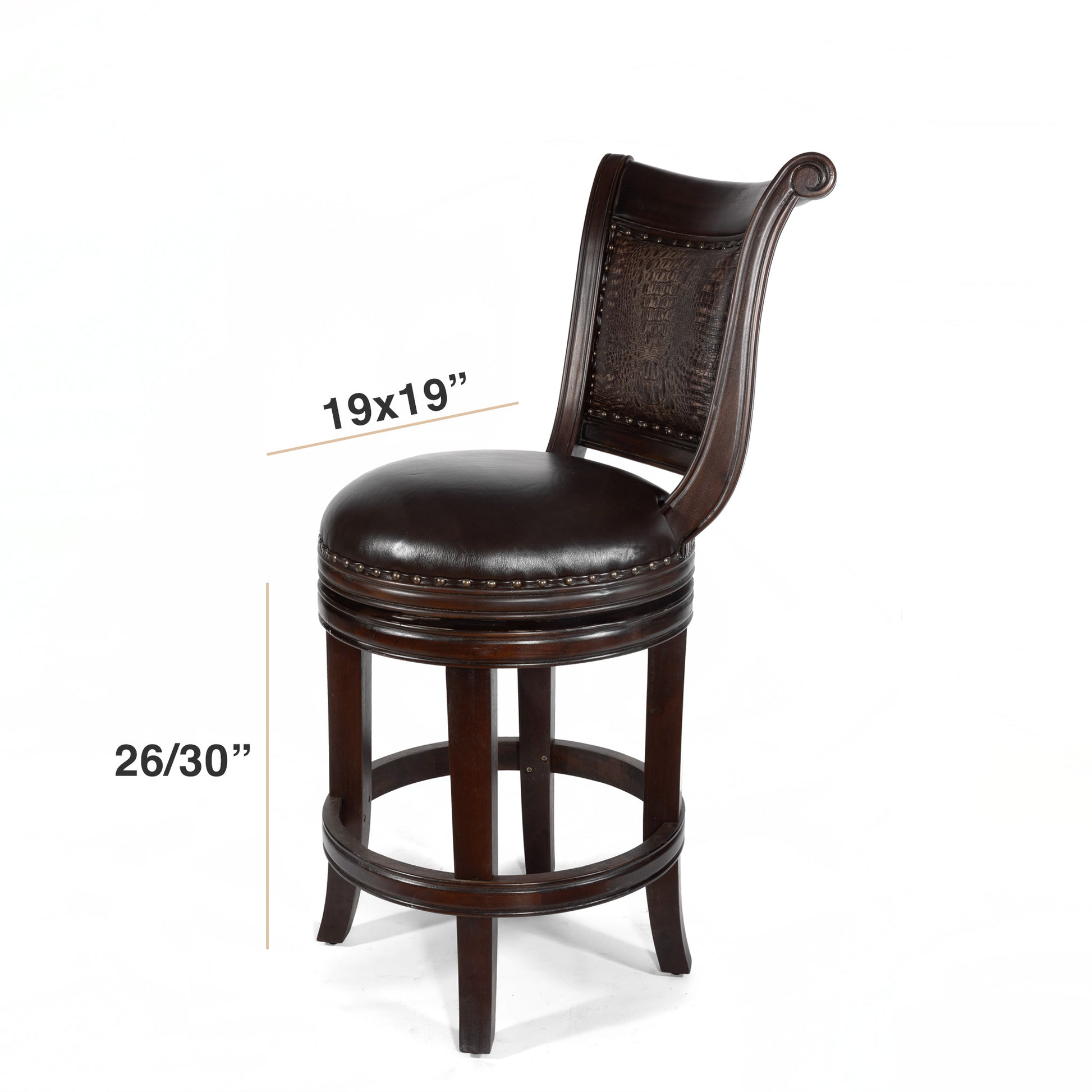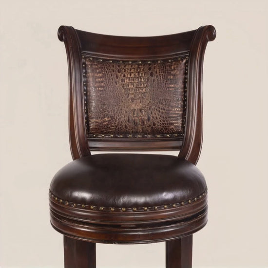A statement piece for any kitchen or bar that is sure to last a lifetime. You can feel and see the quality of the craftsmanship. Made with intricate nail studs, solid wood, and crocodile design that shows from the back and front. The stool swivels 360 degrees for utmost comfort. These colors will tie in with most other furniture and the fine crocodile leather gives it a pop and class up the room. The stool comes in bar (30") and counter height (26").
